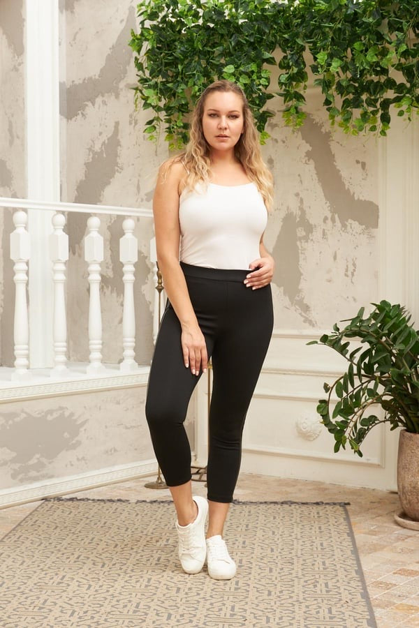 BÜYÜK BEDEN DERİ GARNİLİ SİYAH TAYT PANTOLON