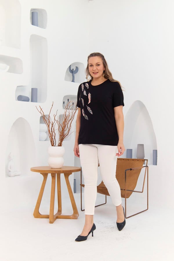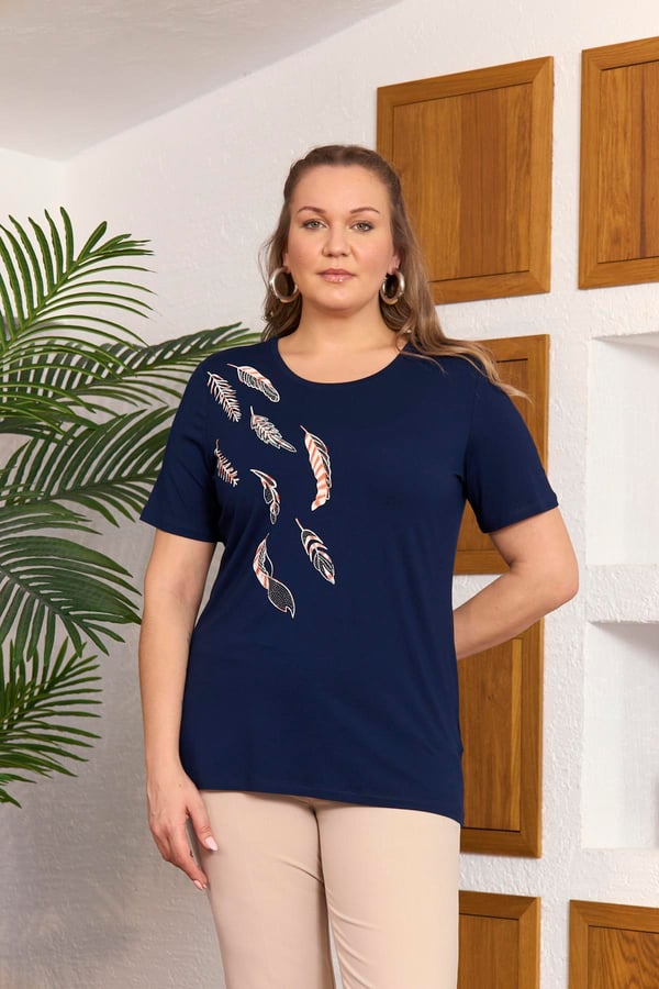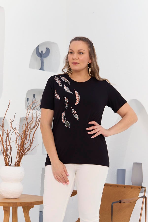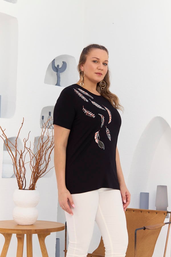 YAPRAK NAKIŞ VE TAŞ İŞLEMELİ BÜYÜK BEDEN TİŞÖRT